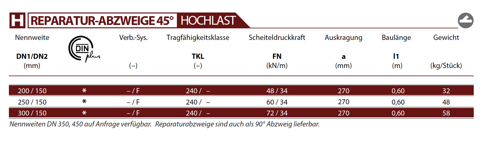 Die Reparatur-Abzweige 45° in Hochlast-Ausführung sind speziell für nachträgliche Anschlüsse und Reparaturen unter hohen Belastungsanforderungen entwickelt. Erhältlich in den Nennweiten DN 200 bis DN 300, bieten sie durch das Verbindungssystem –/F eine zuverlässige Integration in bestehende Rohrnetze.