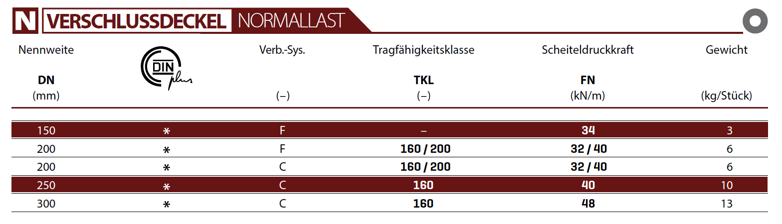 Die Verschlussdeckel in Normallast-Ausführung dienen zur sicheren und dauerhaften Abdichtung nicht benötigter Rohrenden. Sie sind in den Nennweiten DN 150 bis DN 300 erhältlich und in den Verbindungssystemen F und C verfügbar.