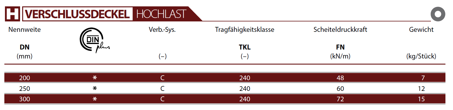 Die Hochlast-Verschlussdeckel sind für den sicheren Abschluss von Rohrleitungen unter besonders hohen Belastungen ausgelegt. Sie sind in den Nennweiten DN 200 bis DN 300 erhältlich und verfügen über das Verbindungssystem C.