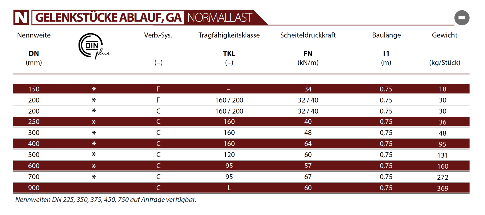 Nennweiten DN 225, 350, 375, 450 und 750 auf Anfrage verfügbar.